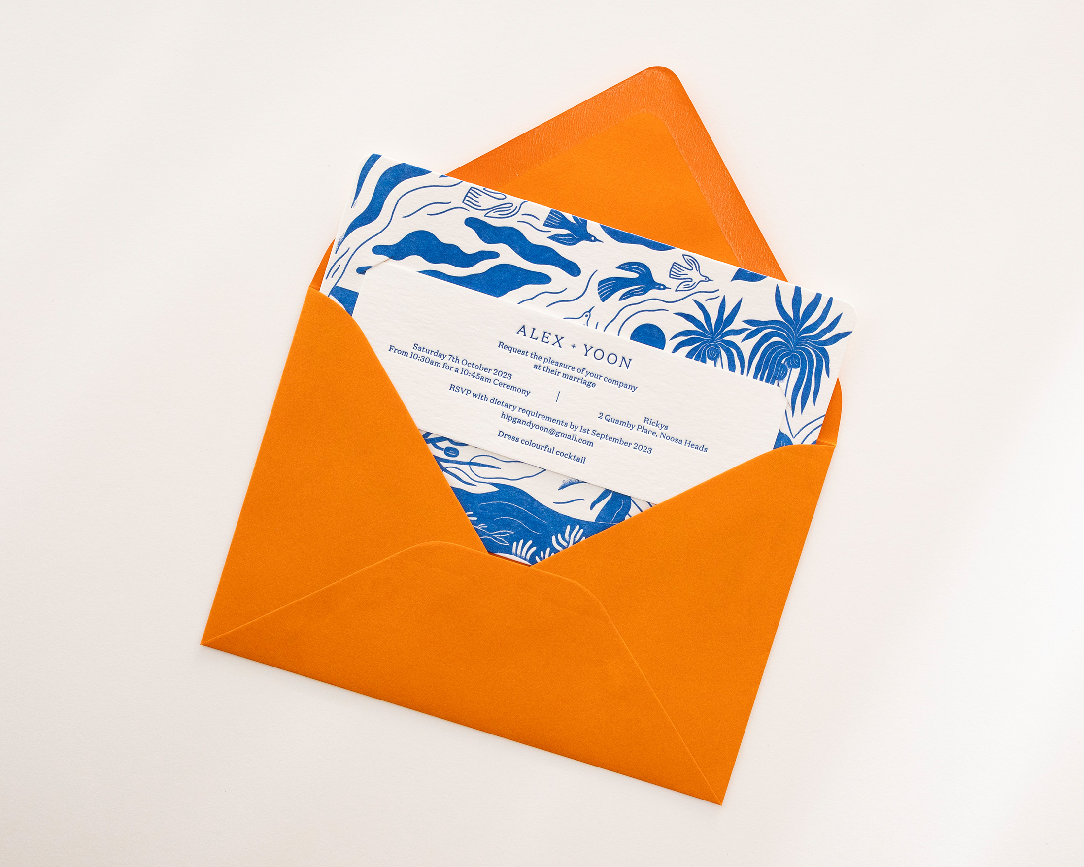 Alex and Yoon brought together their close friends and families by the Noosa River for their wedding. This beautiful locale, cherished for its serene beaches and lush rainforest, serves as the perfect backdrop. We crafted an invitation that encapsulates the essence of Noosa and the joy of Alex and Yoon’s big day. Featuring illustration by